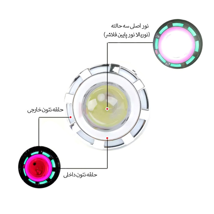 سایر توضیحات: شامل یک عدد لنز مخصوص موتورسیکلت دارای دو ردیف نئون ال ای دی به رنگ سفید و صورتی لامپ اصلی cob نور سفید (نور بالا نور پایین چشمک زن) دارای ال ای دی دویل پشت لنز رنگ قرمز ( جهت قرمز شدن داخل لنز) توان 30 وات نوردهی 1200 لومن رنگ فریم استیل