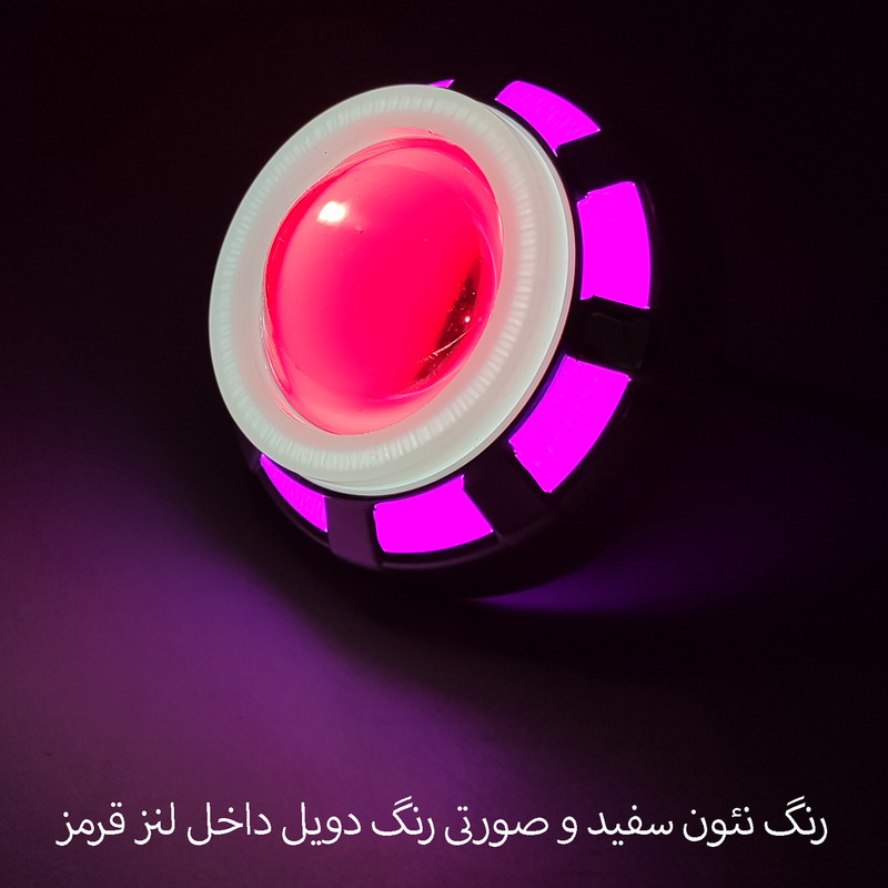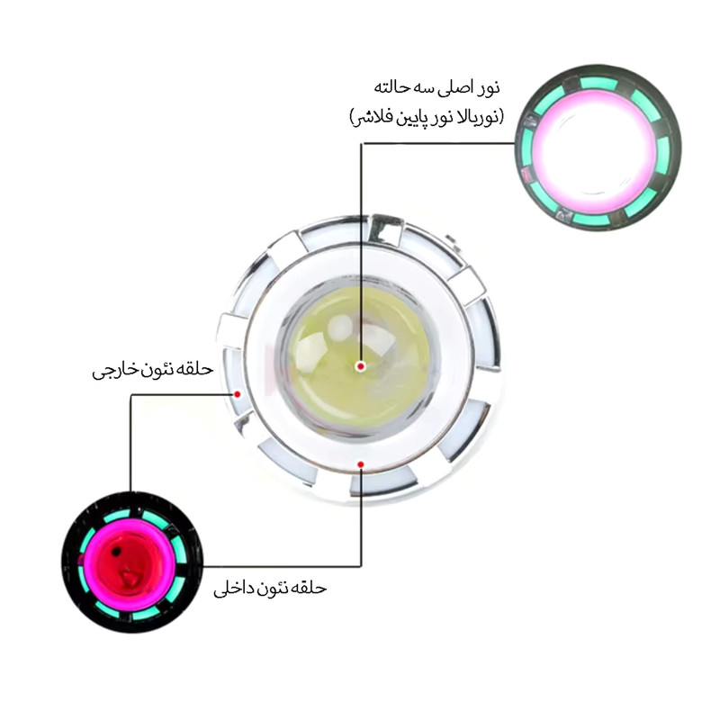 سایر توضیحات: شامل یک عدد لنز مخصوص موتورسیکلت دارای دو ردیف نئون ال ای دی به رنگ سفید و صورتی لامپ اصلی cob نور سفید (نور بالا نور پایین چشمک زن) دارای ال ای دی دویل پشت لنز رنگ قرمز ( جهت قرمز شدن داخل لنز) توان 30 وات نوردهی 1200 لومن رنگ فریم استیل
